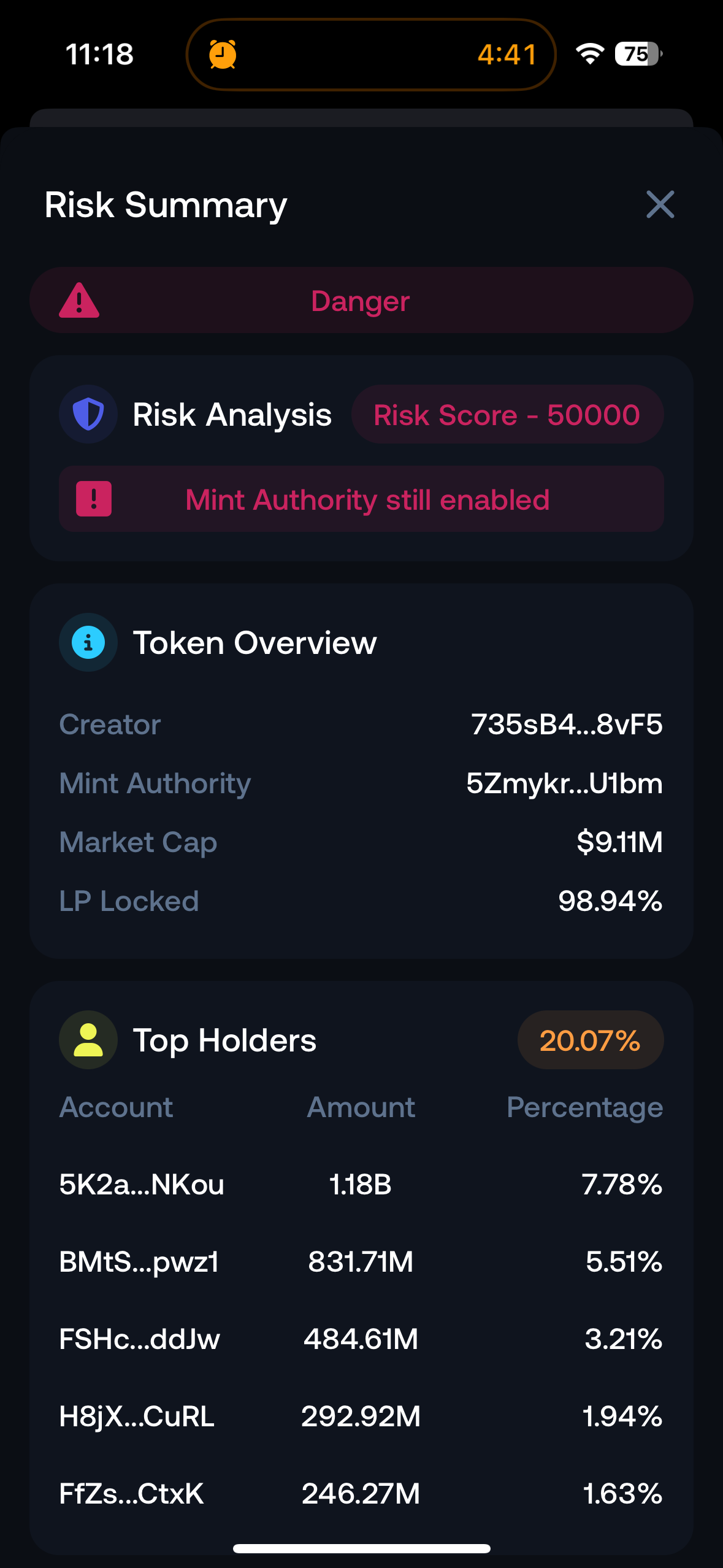 Nest Wallet automatically audits any token you wish to trade and displays a risk score. This can be helpful when trading to make sure the token's LP is locked, there is no blacklisting functionality, etc...